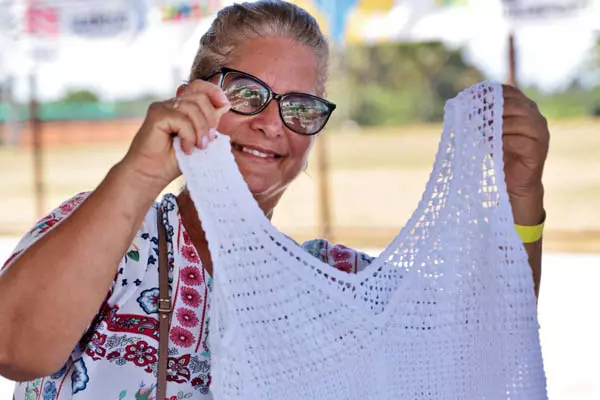 “Trouxe roupas com crochê e bolsas temáticas. Gostei muito dessa iniciativa porque posso ter uma renda a mais e apresentar o meu trabalho, que faço há 35 anos. Tomara que eu consiga vender muito aqui”, afirmou animada.
